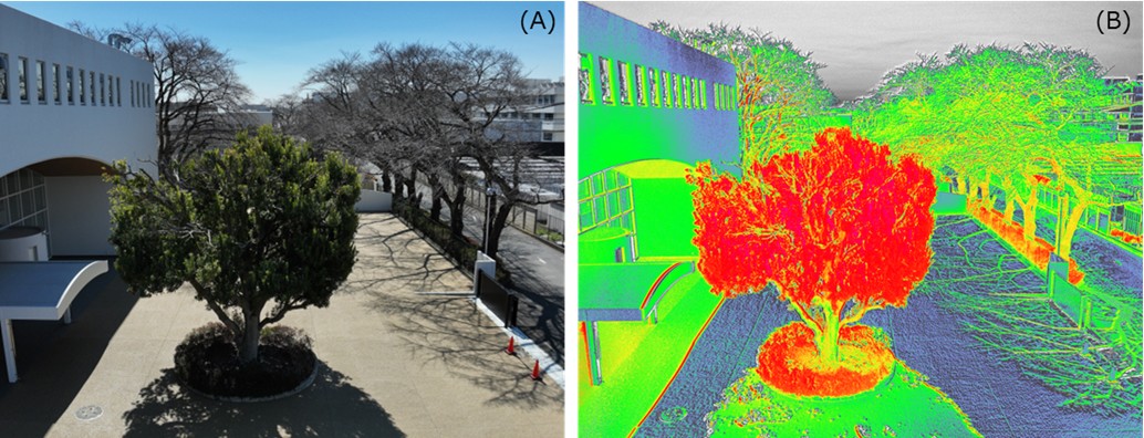 (図)ドローンから撮影した北里大学V号館のRGB画像(A)とNDVI画像(B)